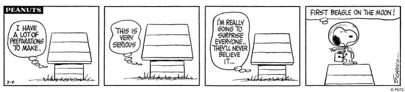Snoopy became the mascot of Apollo 10. The command module was named Charlie Brown and the lunar module was named Snoopy. Because the lunar module was set to skim over the surface of the Moon, it was named Snoopy because it was going to “snoop” around Apollo 11’s future landing site. When the lunar module rendezvoused with the command module after surveying the Moon’s surface, astronaut Thomas Stafford said, "Snoopy and Charlie Brown are hugging each other."